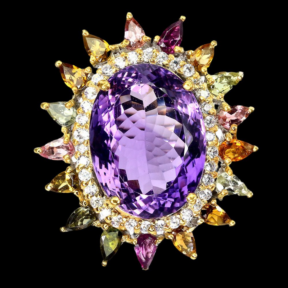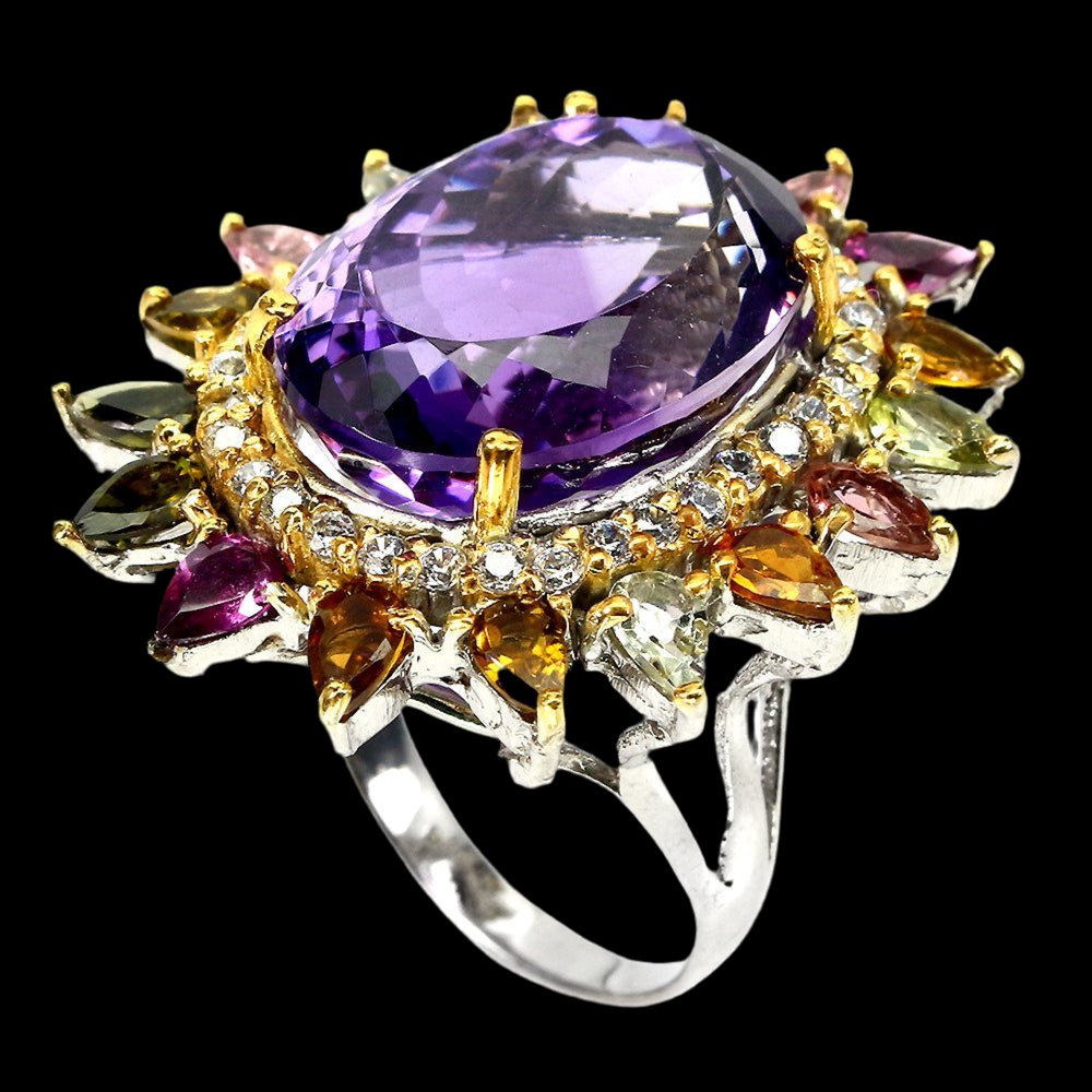 Handcrafted cocktail ring with a 22 carat amethyst, tourmalines in different colors & white zirconia set in 925 sterling silver, 585 white gold and yellow gold plated