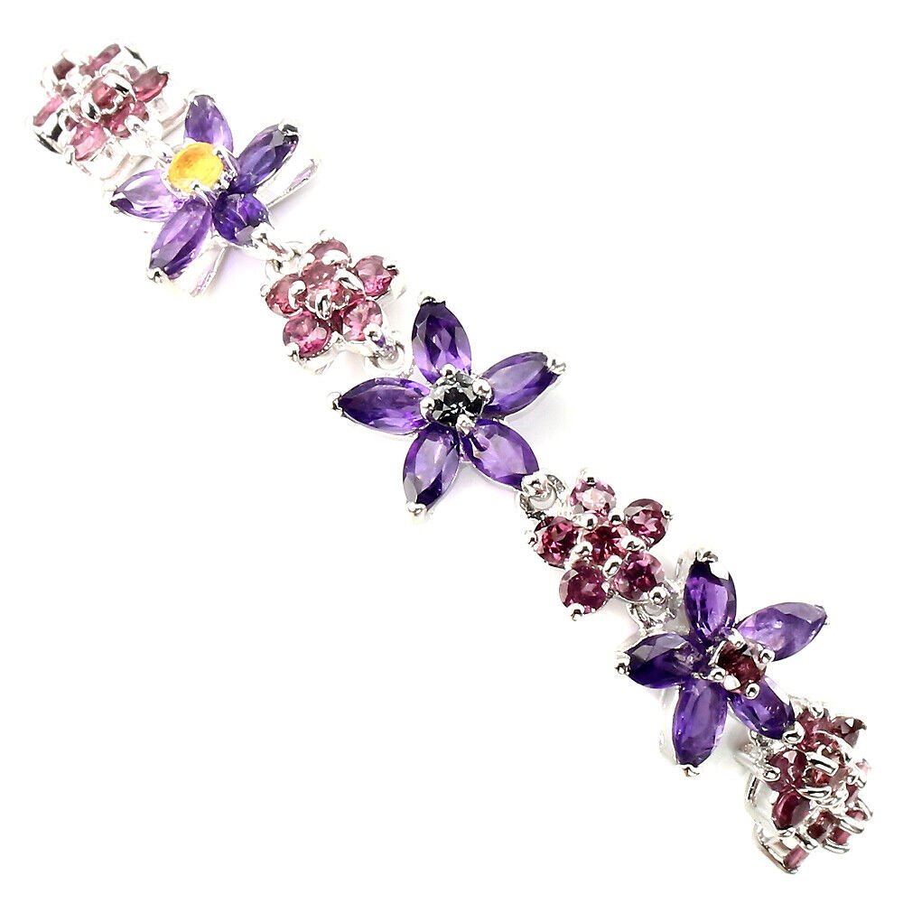 Wonderful flower bracelet with 15 amethysts, 36 rhodolites and 3 sapphires set in 925 sterling silver 585 white gold plated