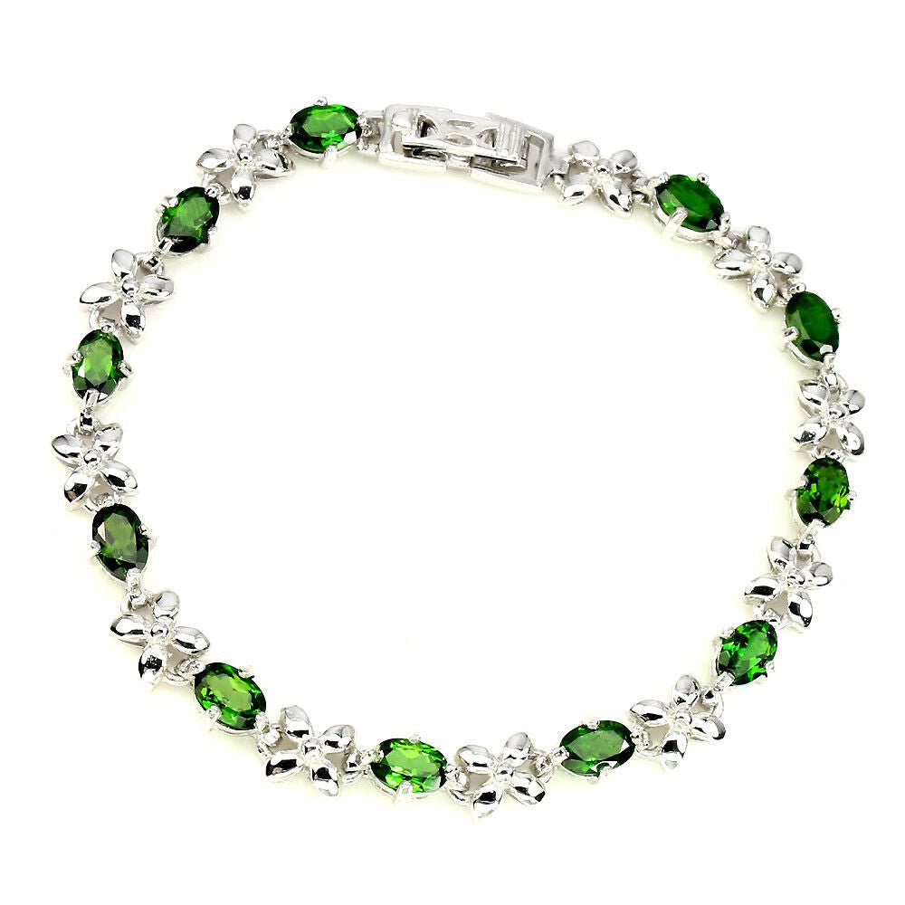 Charming bracelet with small silver flowers and 11 Russian diopsides set in 925 sterling silver 585 white gold plated