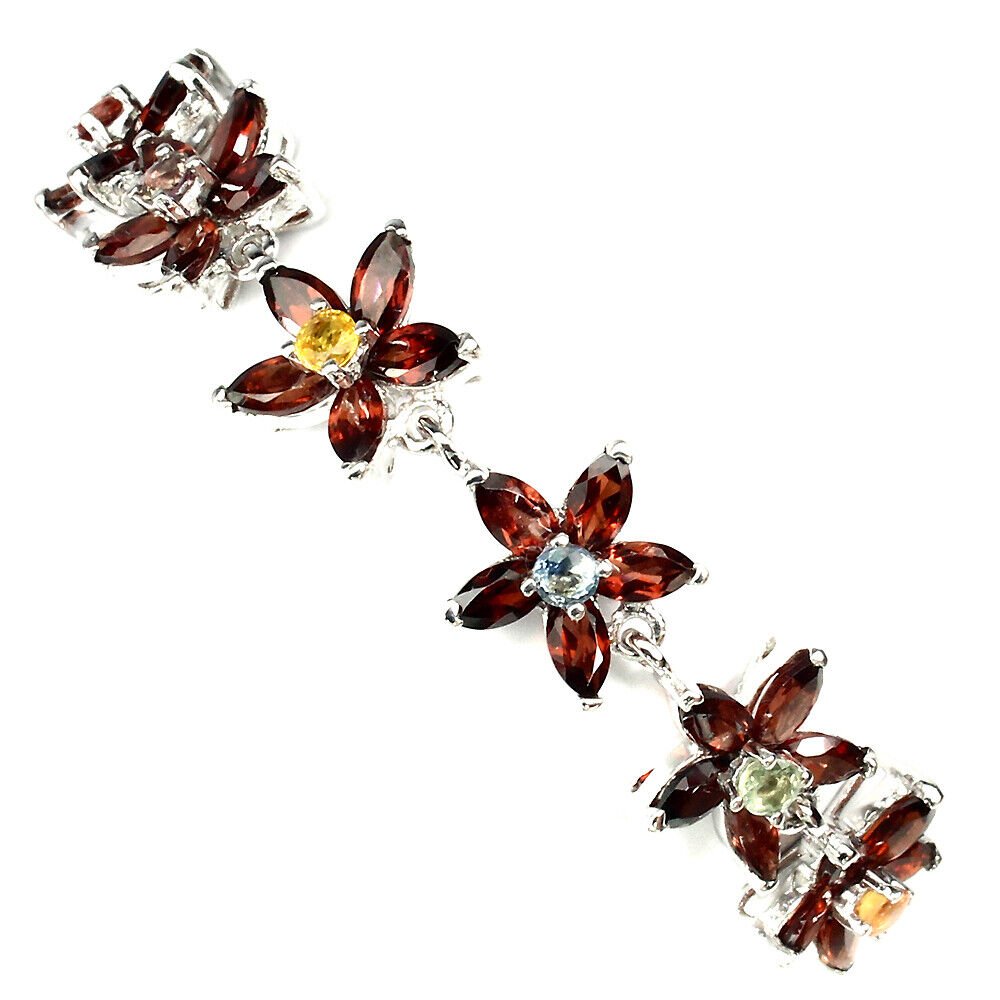 Very decorative bracelet with 30 navette-cut garnet stones and 6 sapphires in different colors set in 925 sterling silver 585 white gold-plated
