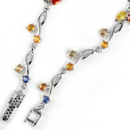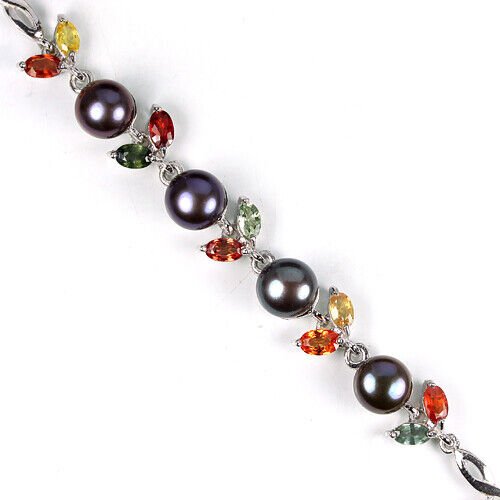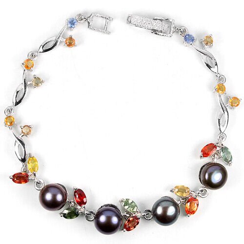 Beautiful bracelet with 4 anthracite-colored freshwater cultured pearls and 20 sapphires in yellow, red, green and blue set in 925 sterling silver 585 white gold plated