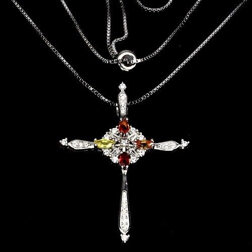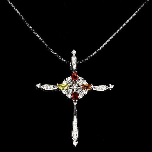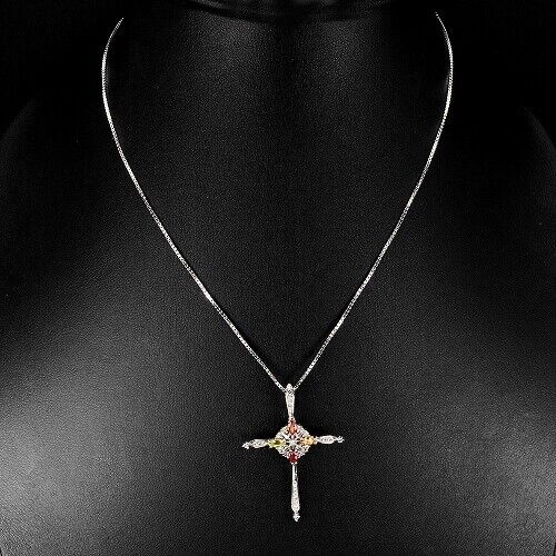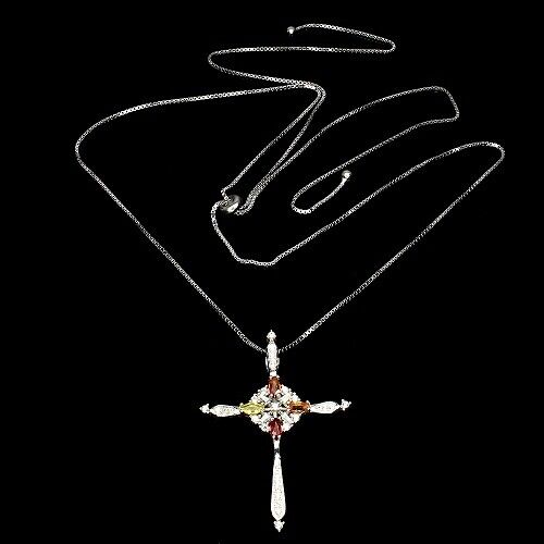 Stylish necklace with a cross with 4 sapphires in yellow orange red & white cubic zirconia set in 925 sterling silver 585 white gold plated