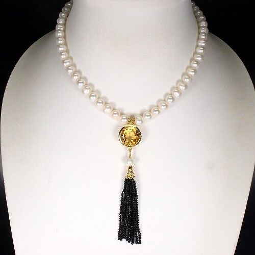 Very attractive necklace with creamy white freshwater cultured pearls, a large citrine in a full frame setting and a tassel made of black spinels set in 925 sterling silver 585 yellow gold plated
