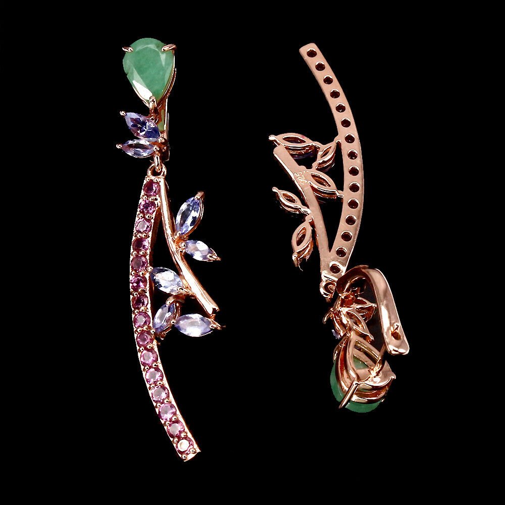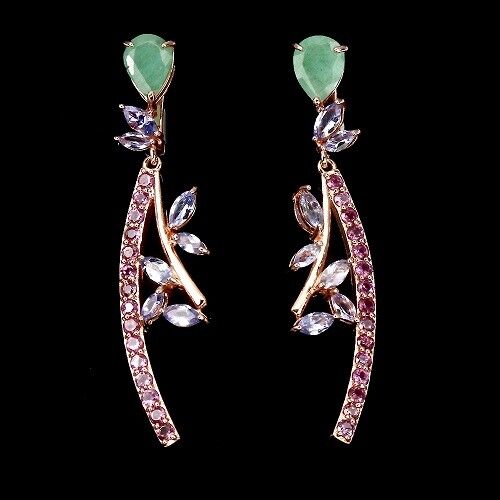 Beautifully designed earrings with a total of 2 emeralds, 14 tanzanites and 30 rhodolites set in 925 sterling silver 585 rose gold plated