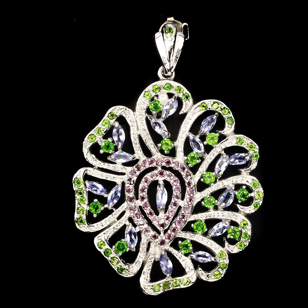 Large pendant with 16 tanzanites, 52 Russian diopsides and 42 rhodolites set in 925 sterling silver 585 white gold plated