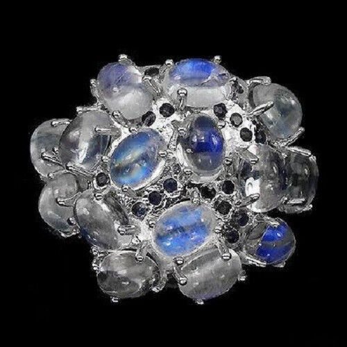 Extravagant large ring with rainbow moonstones and blue sapphires set in 925 sterling silver 585 white gold plated