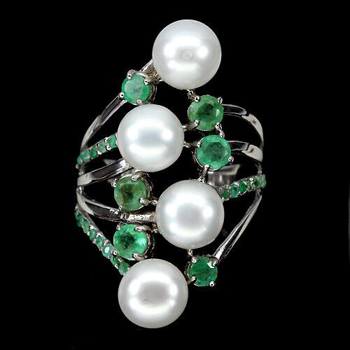 Very decorative ring with emeralds and cream-white freshwater cultured pearls set in 925 Sterling silver 585 white gold plated