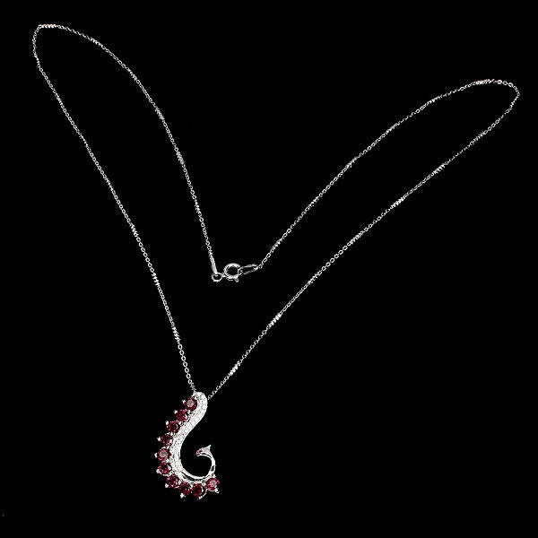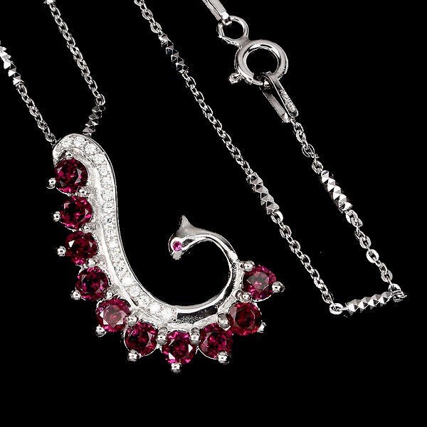 Necklace with peacock pendant with 10 rhodolites & white zirconia set in 925 sterling silver 585 white gold plated