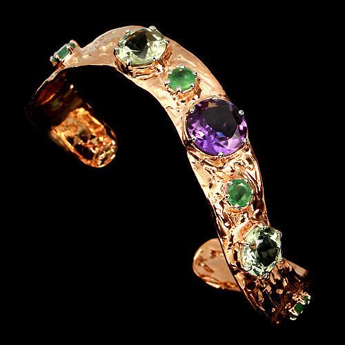 Very unusual, handcrafted bangle with a purple amethyst, 2 light green amethysts (prasiolites) and 6 emeralds set in 925 sterling silver 14 carat rose gold plated