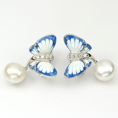 Feminine butterfly earrings with a total of 2 creamy white freshwater cultured pearls & white cubic zirconia set in 925 sterling silver 585 white gold plated