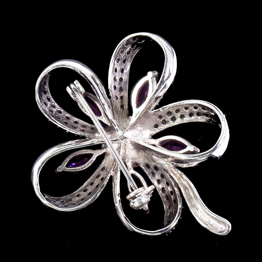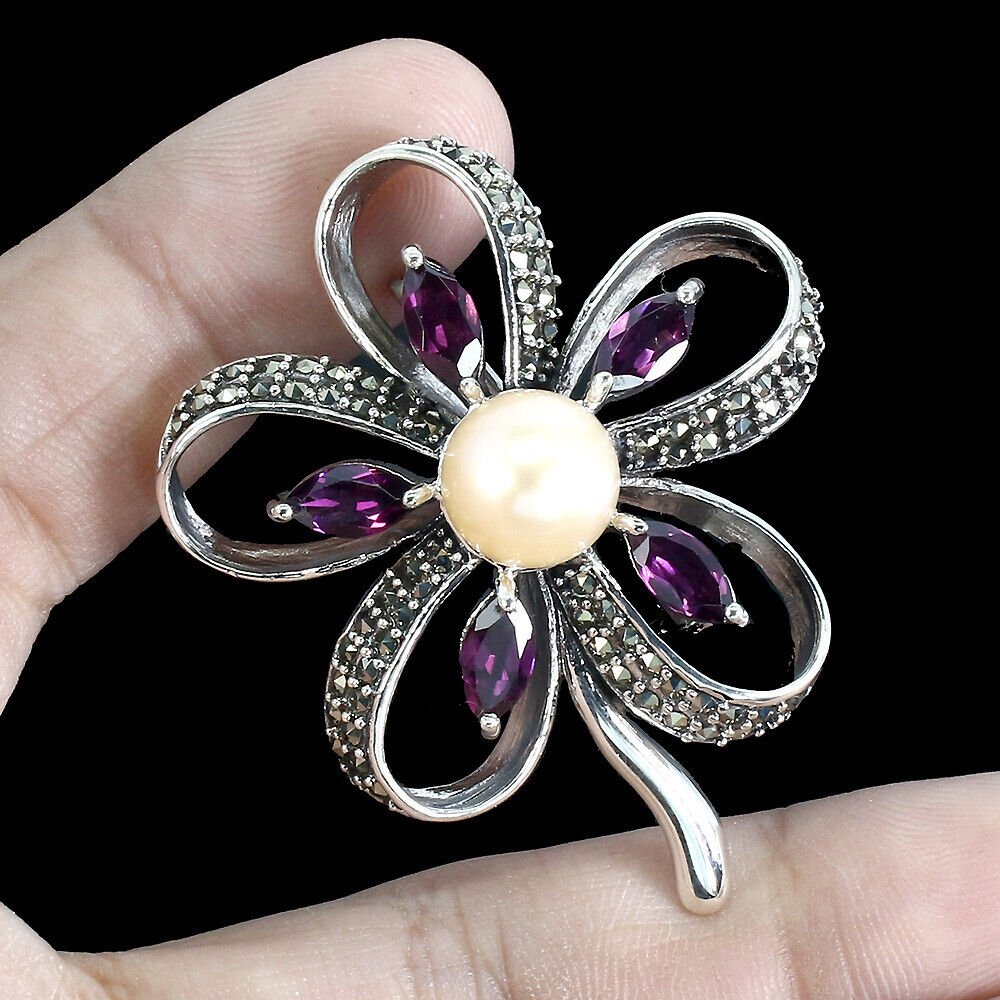 Flower brooch with 5 rhodolites, a creamy white freshwater cultured pearl and marcasites set in 925 sterling silver 585 white gold plated