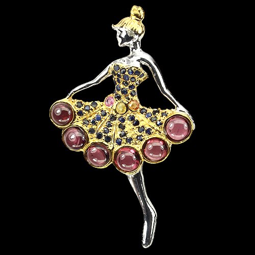 Sweet brooch "Girl with Petticoat" with cabochon cut rhodolites and sapphires in yellow orange pink and blue set in 925 Sterling silver 585 yellow and white gold plated