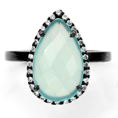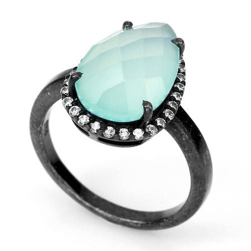 Ring with a blue chalcedony in checkerboard cut & white cubic zirconia set in 925 sterling silver black rhodium plated