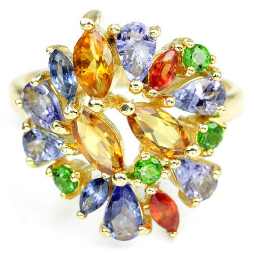 Beautiful ring with sapphires in different colors, tanzanites and Russian diopsides set in 925 sterling silver 585 yellow gold plated