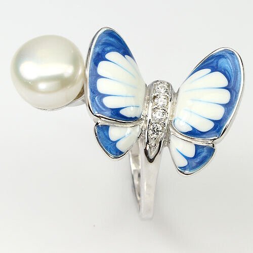 Sweet butterfly ring with a creamy white freshwater cultured pearl & white cubic zirconia set in 925 sterling silver 585 white gold plated