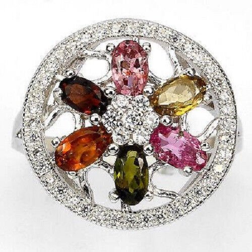 Beautiful ring with 6 tourmalines in different colors & white cubic zirconia set in 925 sterling silver 585 white gold plated