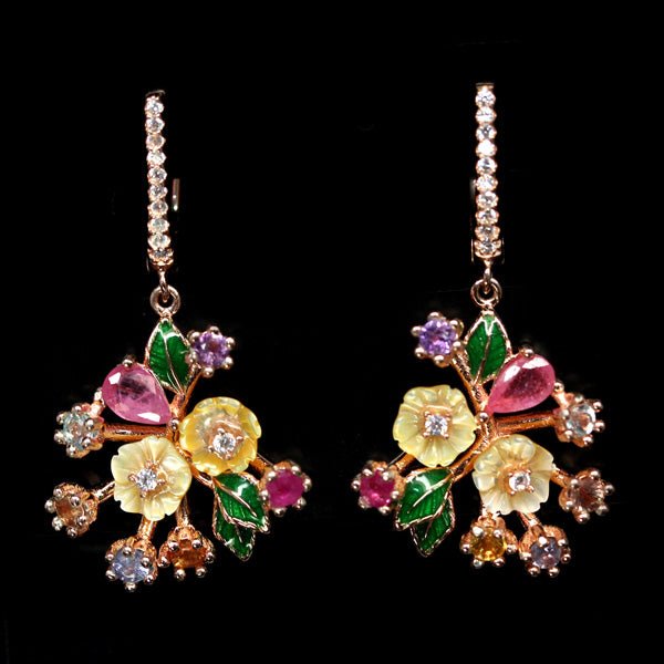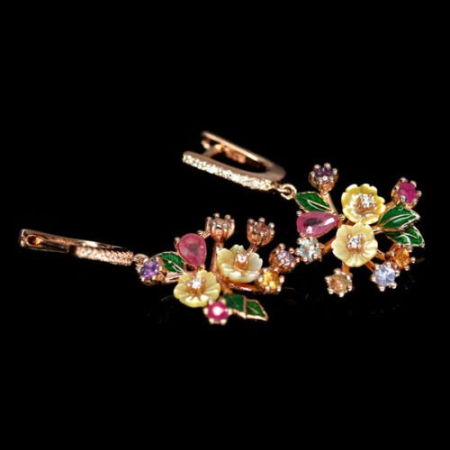 Earrings with rubies, citrines, amethysts, sapphires, tanzanites, blue topazes, mother-of-pearl flowers & white zirconia set in 925 sterling silver 14 carat rose gold plated