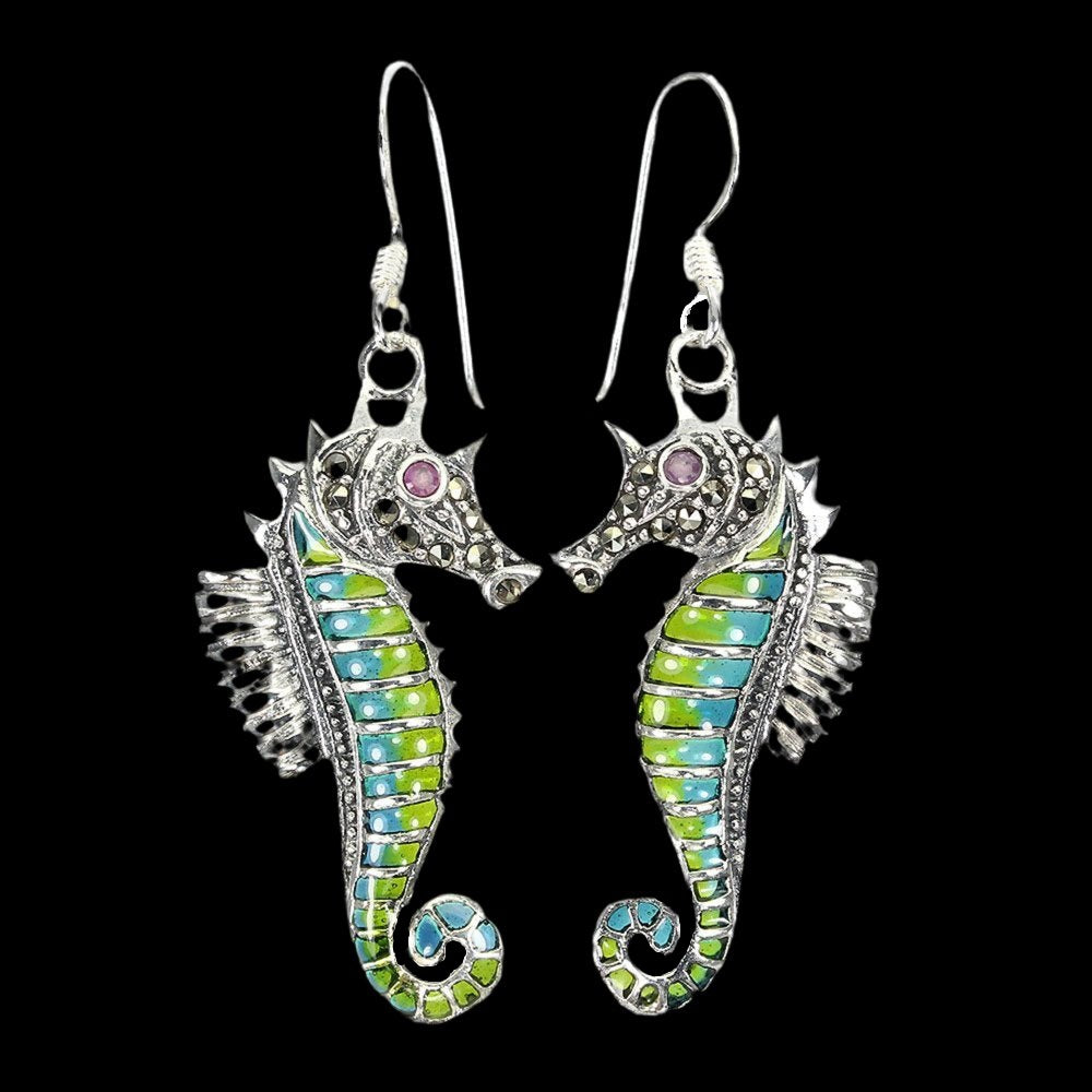 Seahorse earrings with rubies and marcasites set in 925 sterling silver 14 carat white gold plated