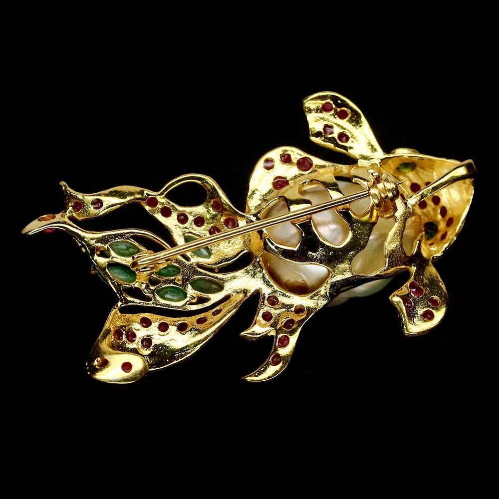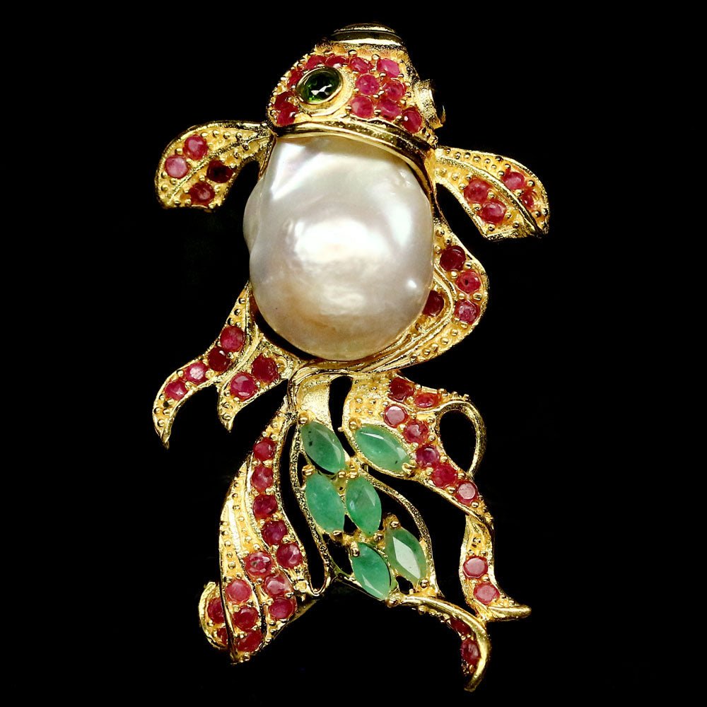 Fish pendant with a large baroque pearl, rubies, emeralds and chrome diopside set in 925 sterling silver, 14 carat yellow gold plated