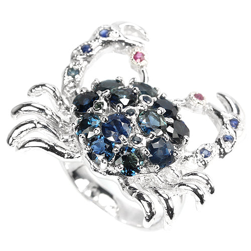 Cute crab ring with blue sapphires and rubies set in 925 sterling silver 14 carat white gold plated