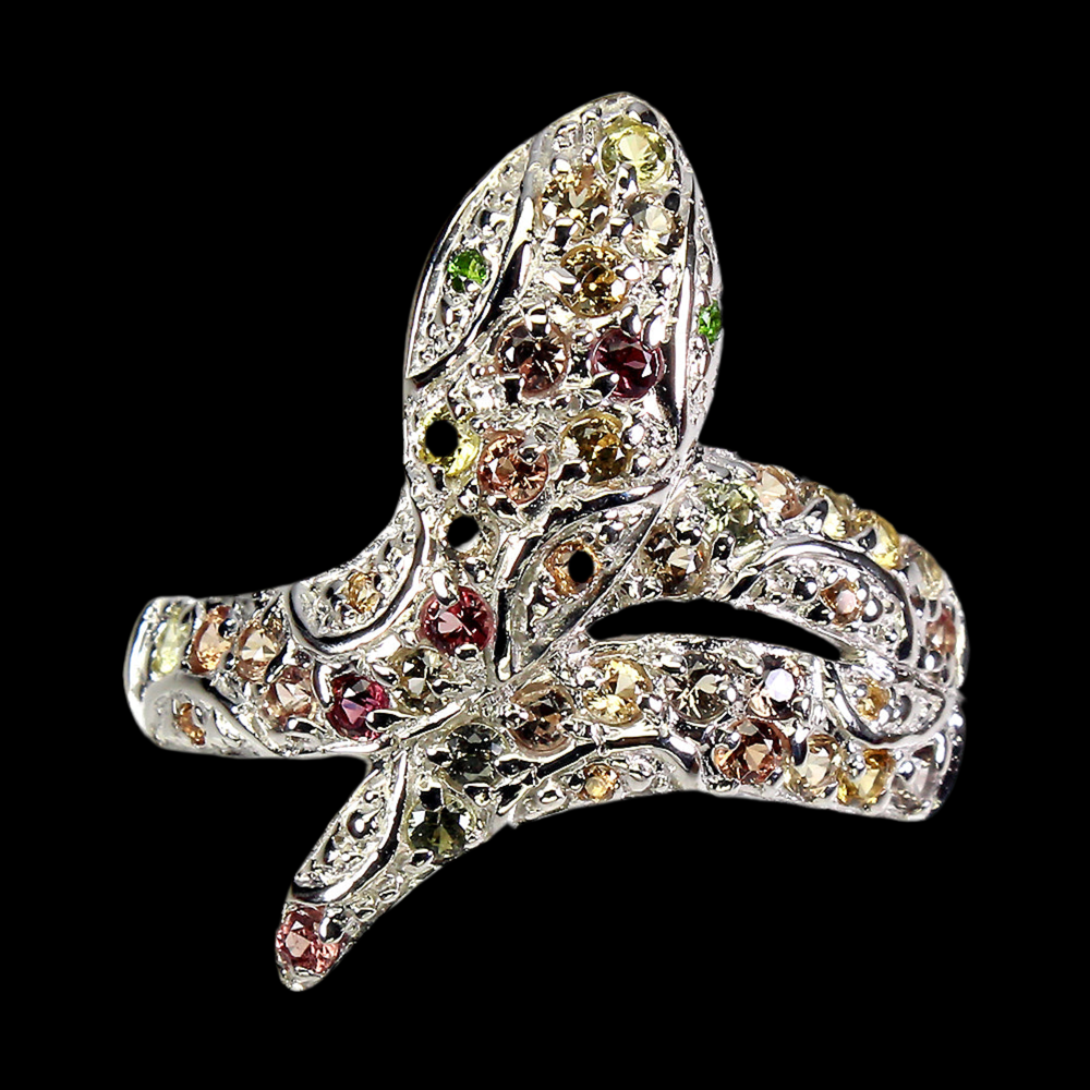 Snake ring with sapphires in different colors and Russian diopsides (eyes) set in 925 sterling silver 14 carat white gold plated