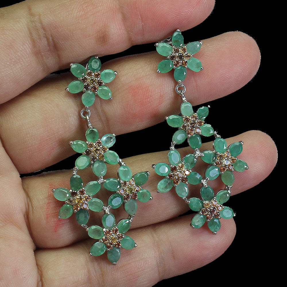 Earrings with emeralds and sapphires in various colors, set in 925 sterling silver and plated with 14-karat white gold