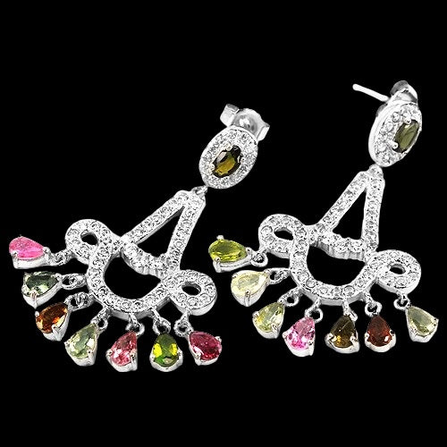 Pendientes de plumas de pavo real con turmalina, rubí y zafiro