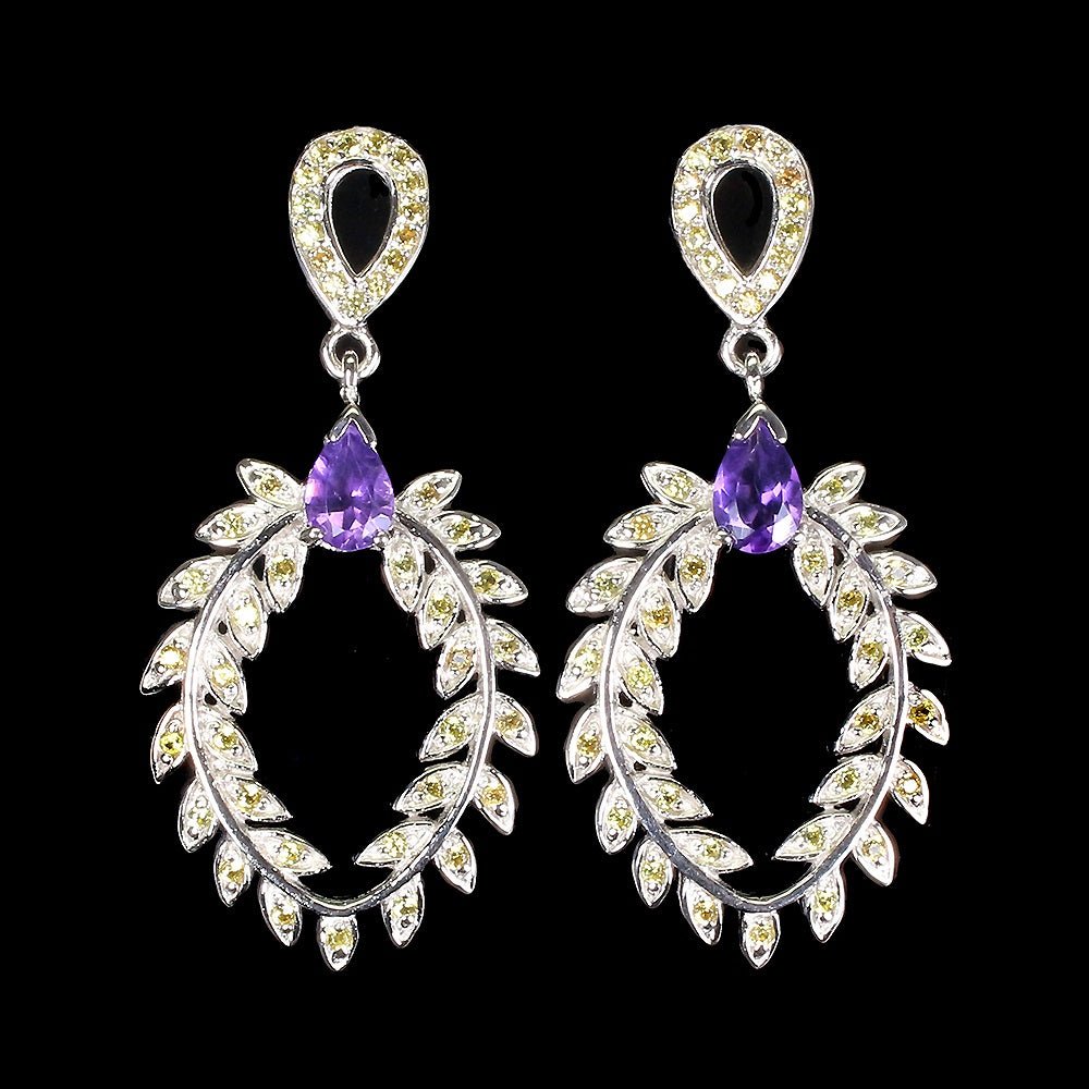 Pendientes grandes con amatistas y zafiros amarillos engastados en plata de primera ley 925 y baño de oro blanco de 14 quilates