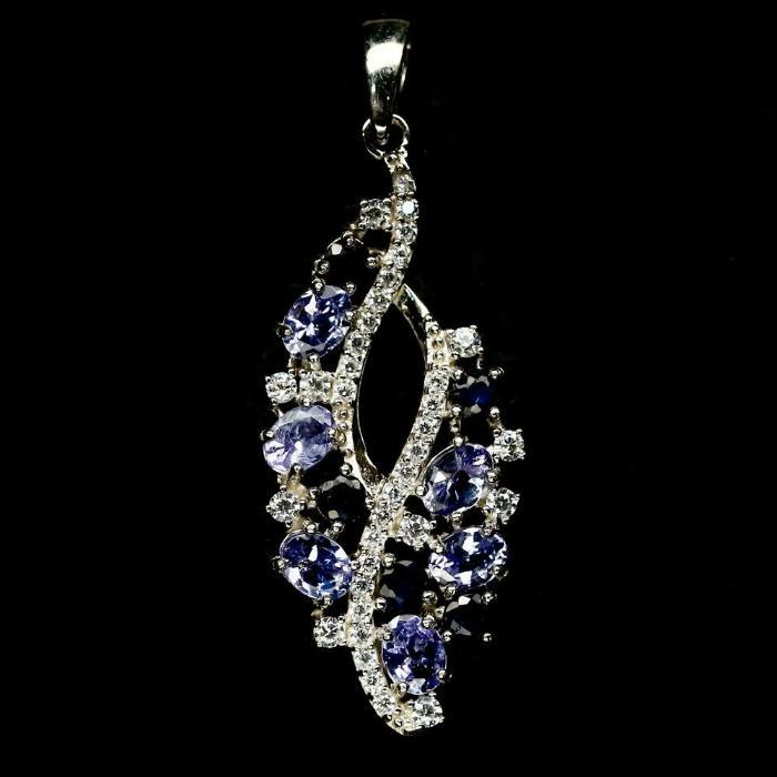 Colgante con tanzanitas, zafiros azul oscuro y circonitas blancas engastadas en plata de ley 925 bañada en oro blanco de 14 quilates