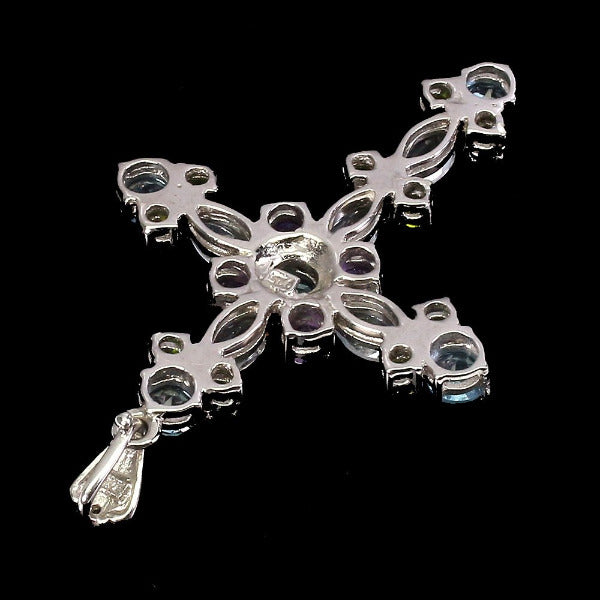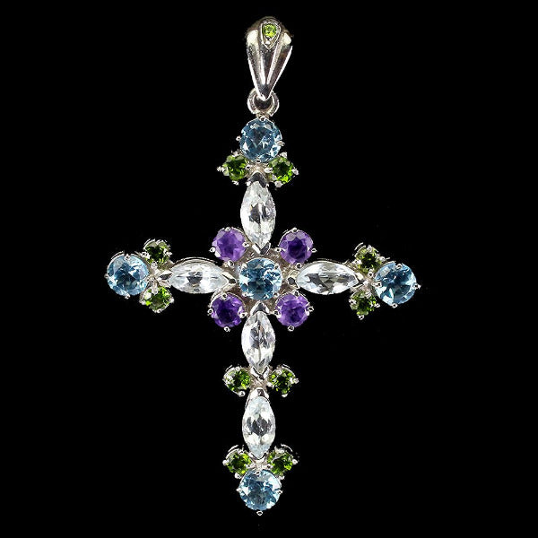 Colgante de cruz grande con aguamarinas, amatistas, topacios azules de color azul cielo y diópsidos cromados engastados en plata de ley 925 y baño de oro blanco de 14 quilates.