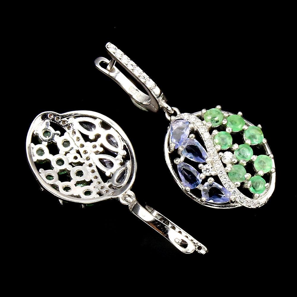 Pendientes con esmeraldas, tanzanitas y circonitas blancas engastados en plata de ley 925 bañada en oro blanco de 14 quilates
