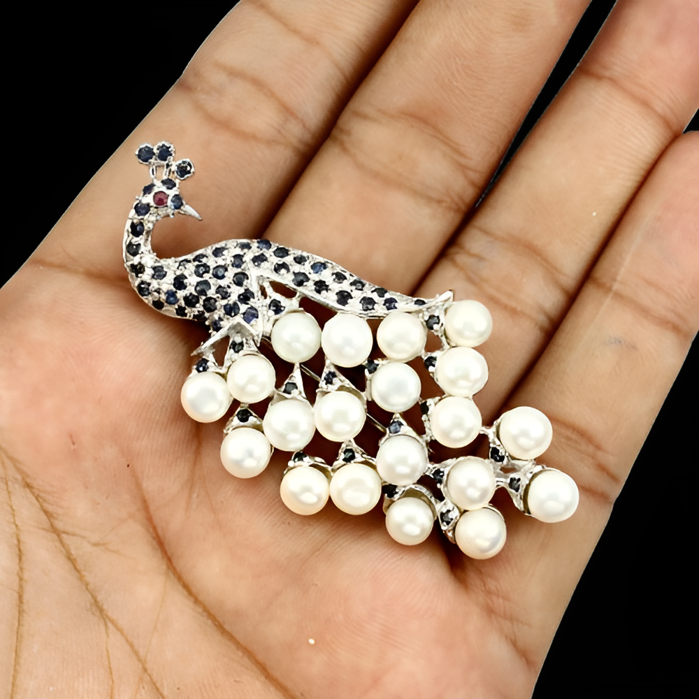 Pfauen-Brosche mit einem Rubin, blauen Saphiren und cremeweißen Süßwasser-Zuchtperlen gefasst in 925 Sterlingsilber 14 Karat Weißgold vergoldet