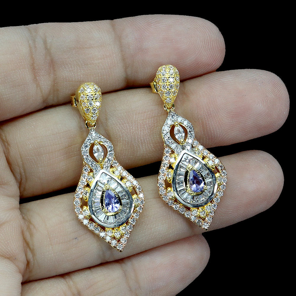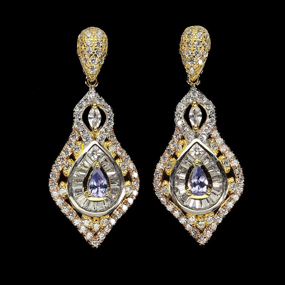 Pendientes con tanzanitas y circonitas blancas engastadas en plata de ley 925, chapados en oro blanco de 14 quilates, oro amarillo y oro rosa.