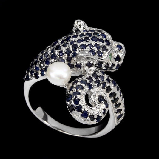 Bague Gros Chat Saphir Perle Émeraude Taille 56