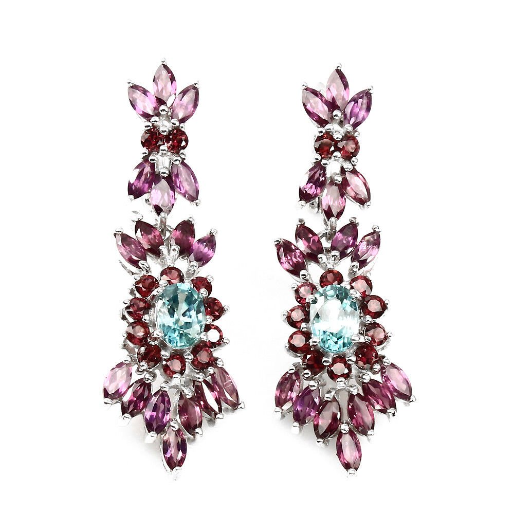 Grandi orecchini con un totale di 58 rodoliti e 2 veri zirconi blu (niente zirconi!) incastonati in argento sterling 925 placcato oro bianco 585