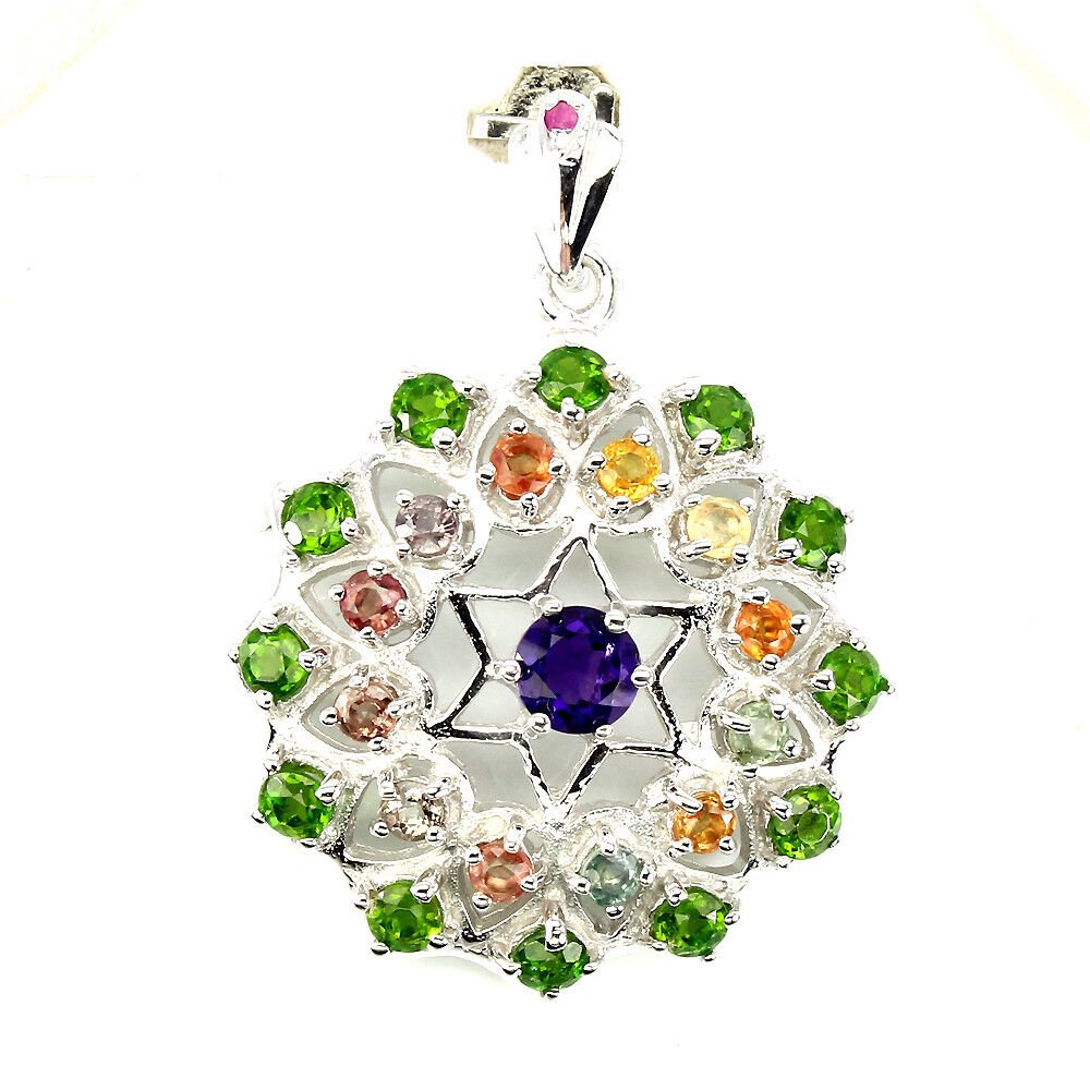 Ciondolo decorativo con 12 diopside russo, 12 zaffiri in diversi colori, 1 ametista e 1 rubino incastonati in argento sterling 925 placcato oro bianco 585