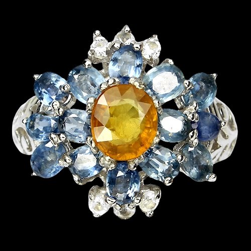 Anello nobile con uno zaffiro giallo-arancio e 14 zaffiri blu e 6 topazi bianchi incastonati in argento sterling 925 585 placcato in oro bianco