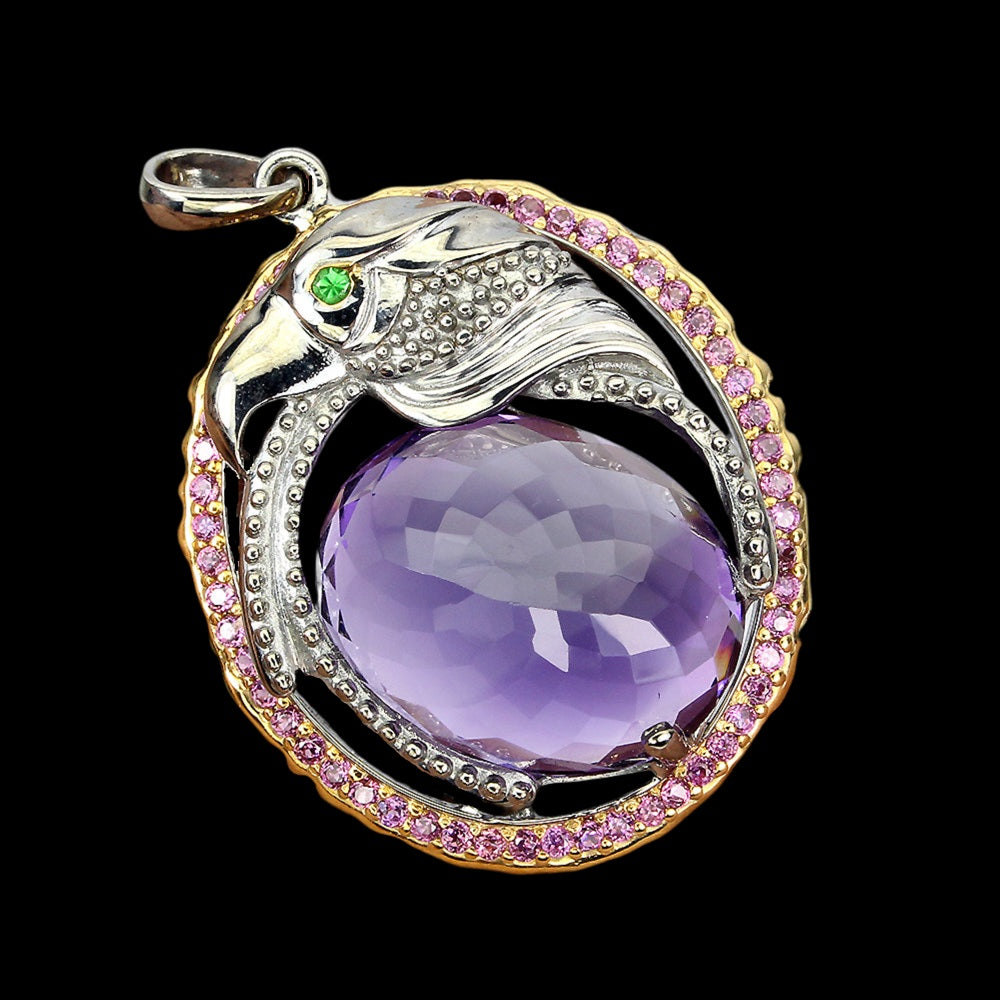 Handgemaakte adelaarhanger met een 21-karaats amethist, een Russische diopsiet en rhodolieten gezet in zwart gerhodineerd 925 sterling zilver en gedeeltelijk verguld in 14-karaats geelgoud