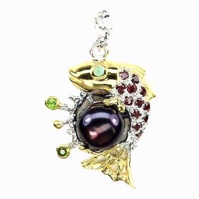 Charmante vishanger met een pauwkleurige zoetwaterkweekparel, 12 rhodolieten, 1 Russische diopsiet, 1 peridoot en 1 smaragd gezet in 925 sterling zilver 585 wit- en geelgoud verguld
