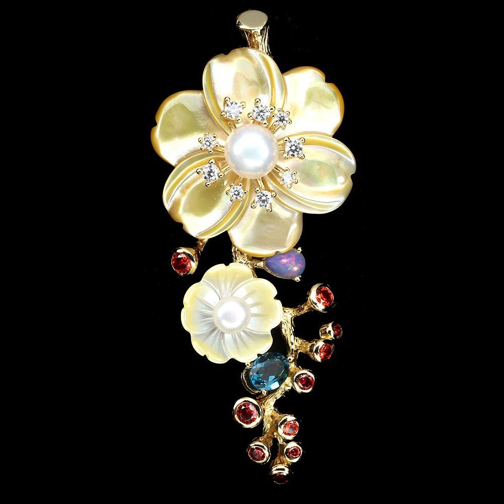 Prachtig bloemig vormgegeven hanger met 10 granaatstenen, een blauwe topaas in de kleur London Blue, een opaal, 2 roomwitte zoetwatercultuurparels, 2 parelmoer bloemen & witte zirkonia gezet in 925 sterling zilver 585 geel goud verguld