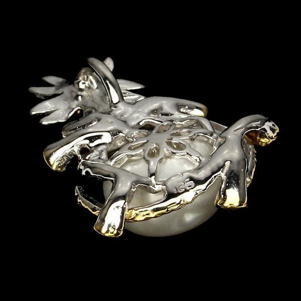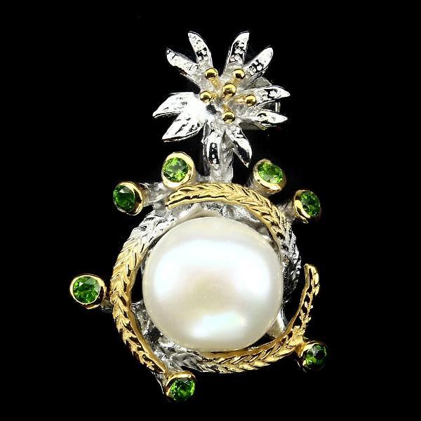 Handgemaakte hanger met witte zoetwaterkweekparel en Russische diopsiden gezet in 925 sterling zilver, 14 karaat witgoud en geelgoud verguld