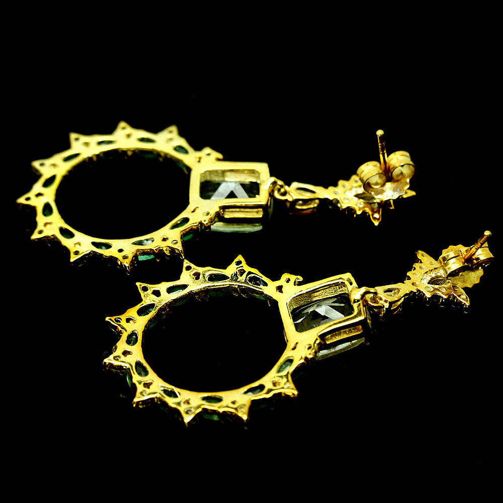 Oorbellen met prasiolieten (groene amethisten), smaragden, saffieren in verschillende kleuren en rhodolieten gezet in 925 sterling zilver en 14 karaat geelgoud verguld