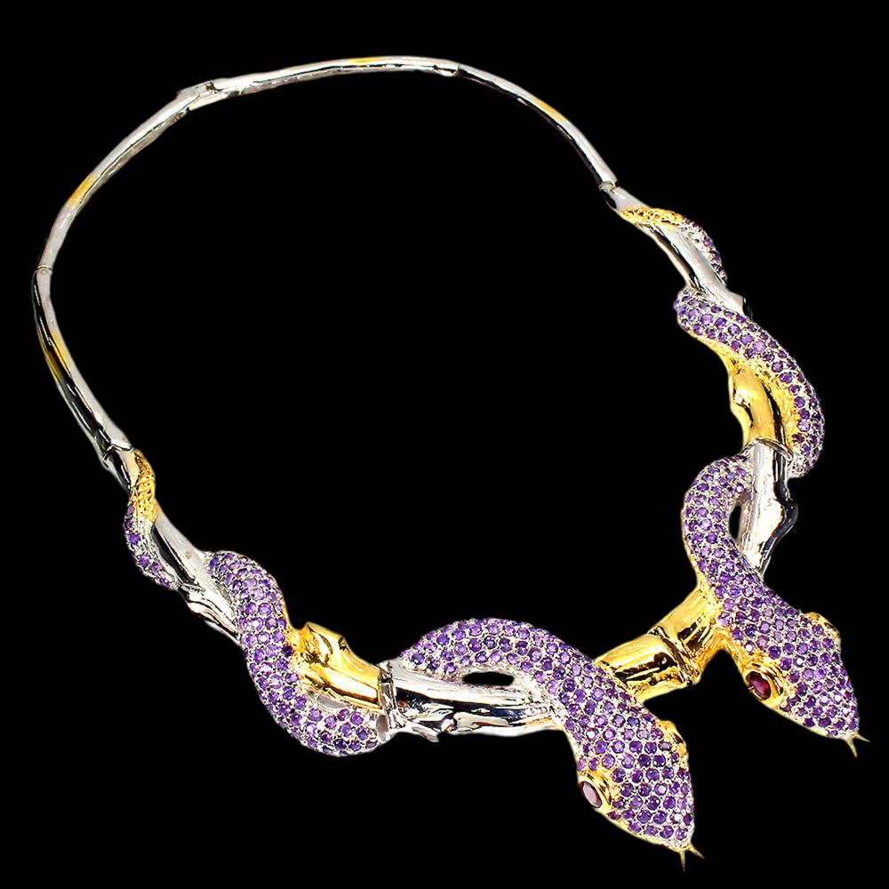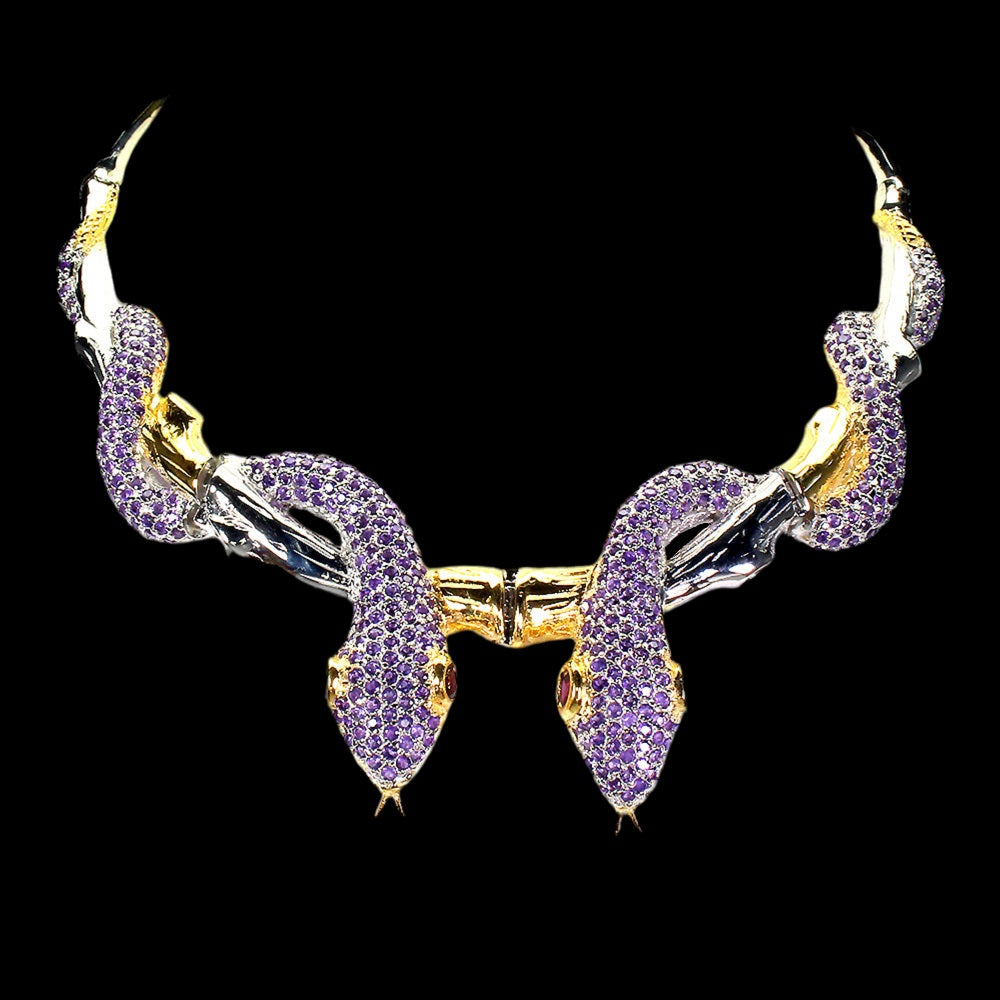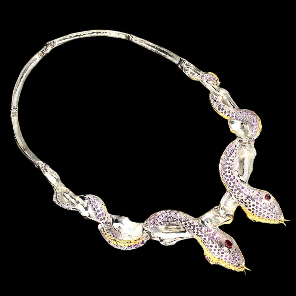 Exotische slangenhalsketting met amethisten en rhodolieten (ogen) gezet in 925 sterling zilver, 14 karaat witgoud en geelgoud verguld