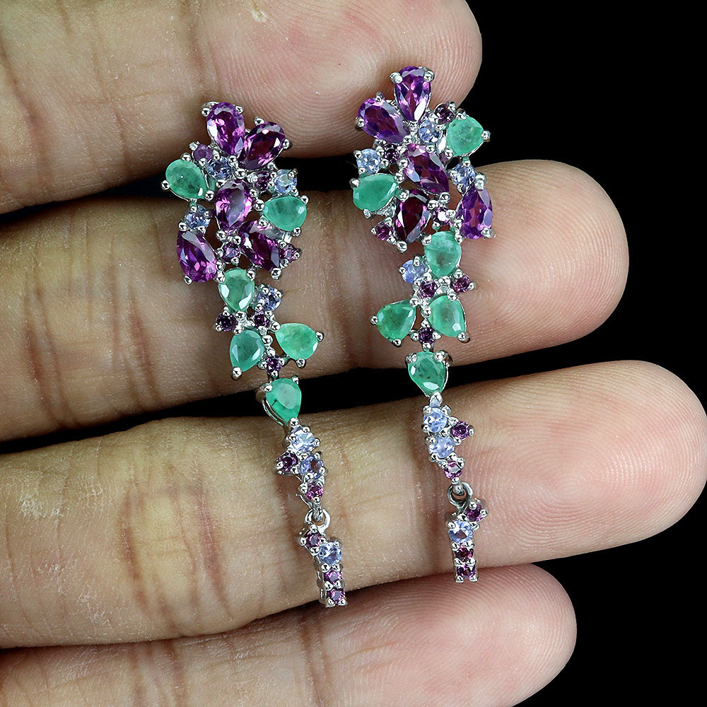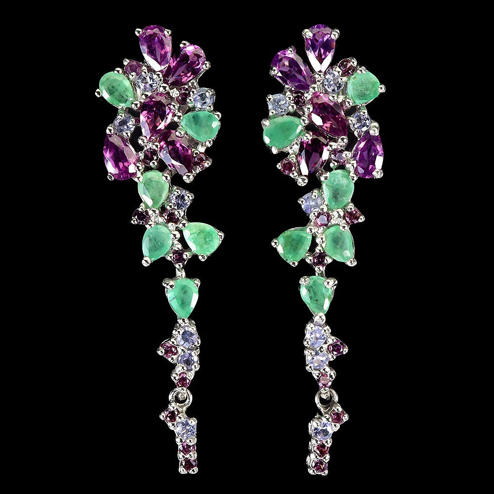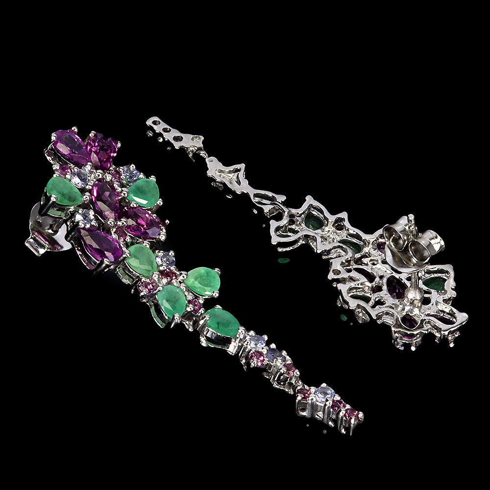 Oorbellen met smaragden, rhodolieten en tanzanieten gezet in 925 sterling zilver en 14 karaat witgoud verguld
