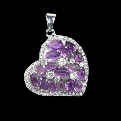 Herz-Anhänger mit Amethysten im Cabochonschliff & weißen Zirkonia gefasst in 925 Sterlingsilber 585 Weißgold vergoldet