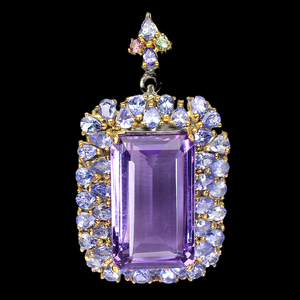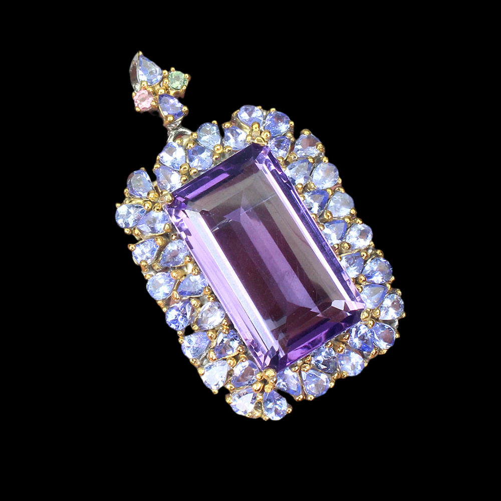 Wunderschöner handgearbeiteter Anhänger mit einem Amethyst, Tansaniten und Turmalinen gefasst in 925 Sterlingsilber 14 Karat Weißgold und Gelbgold vergoldet