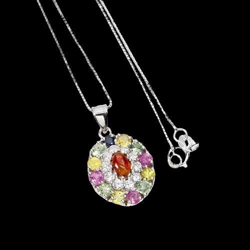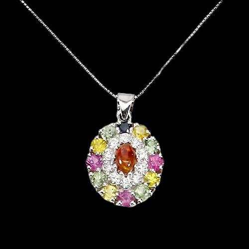 Halskette mit Anhänger mit einem Bernstein in der Mitte, Saphiren in verschiedenen Farben & weißen Zirkonia gefasst in 925 Sterlingsilber 14 Karat Weißgold vergoldet