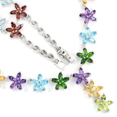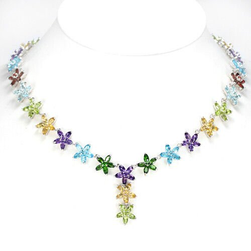 Bezauberndes Blüten-Collier mit 7 Amethysten, 6 Peridoten, 6 russischen Diopsiden, 5 Granaten, 5 Blautopasen in der Farbe Swiss Blue und 5 Citrinen gefasst in massivem 925 Sterlingsilber 585 weißvergoldet