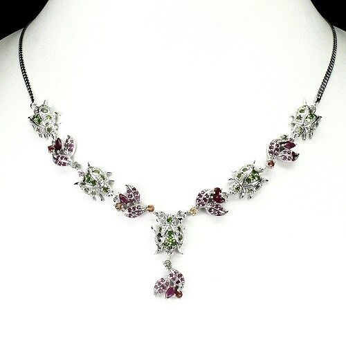 Bezauberndes Collier mit Marienkäfern und Blüten besetzt mit russischen Diopsiden, Rubinen und Saphiren (gelb, orange und grün) gefasst in 925 Sterlingsilber 585 weißvergoldet