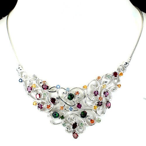 Sehr schönes Collier mit schwarzen Opalen, Rhodoliten und Saphiren in gelb orange grün blau gefasst in 925 Sterlingsilber 585 weißvergoldet